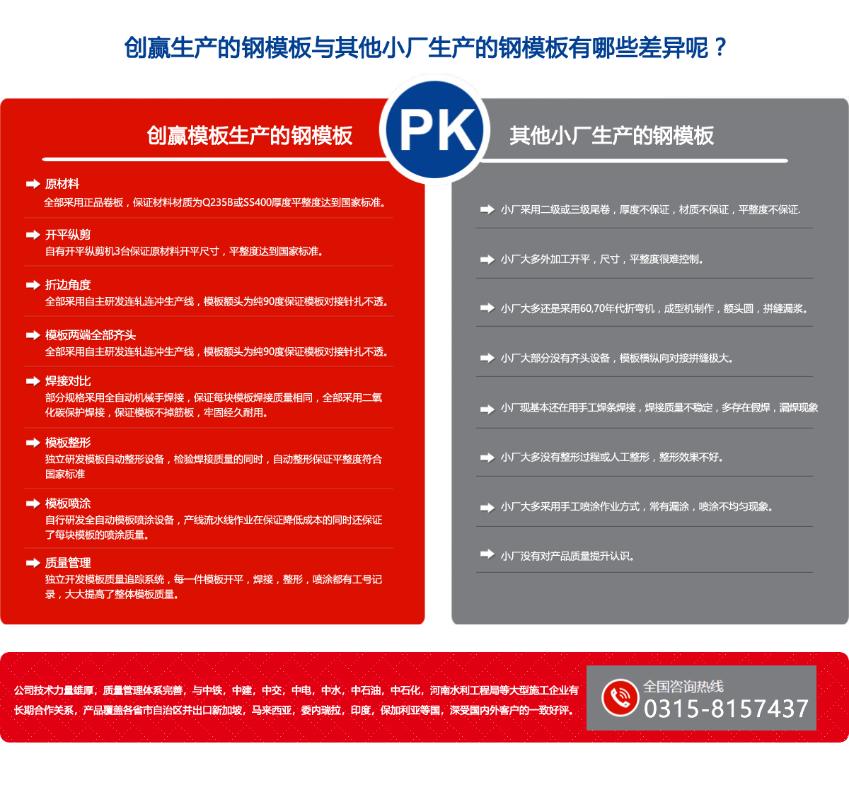 唐山創(chuàng)贏模板有限公司(原唐山豐南雙贏金屬結(jié)構(gòu)廠)始建于一九九七年,是具規(guī)模實力的組合模板生產(chǎn)企業(yè),公司自行設(shè)計制造的十二條上卷,連軋,連沖,整形,機(jī)械人焊接,調(diào)直,噴漆,打包鋼模板生產(chǎn),實現(xiàn)了自動化一條龍生產(chǎn),品質(zhì)優(yōu),效率高,規(guī)格型號為:寬度100-1200mm, 長度300-3000mm, 板厚1.8-4.0mm。 年產(chǎn)量可達(dá)200萬平方米,公司創(chuàng)新研制的輕型鋼框組合快拆鋼模板體系,是傳統(tǒng)組合小鋼模升級換代產(chǎn)品,可滿足房建,地下管廊,涵洞,公路,鐵路及各類施工企業(yè)的需要,輕型鋼框組合快拆鋼模板體系介紹及應(yīng)用,已在2017年《施工技術(shù)》雜志及《模板腳手架行業(yè)協(xié)會》雜志發(fā)表,詳情請查閱公司網(wǎng)站。 公司生產(chǎn)的噴漆鋼跳板,鍍鋅鋼跳板,采用連軋一次沖孔,承載力大,孔距均勻,外形美觀,年產(chǎn)量可達(dá)50萬塊,公司獨創(chuàng)的C型鋼生產(chǎn)線,以其產(chǎn)量高,強度大,成本低,交活迅速,在同行業(yè)占有較大優(yōu)勢,可與C型鋼廠家及各類施工企業(yè)合作共贏.